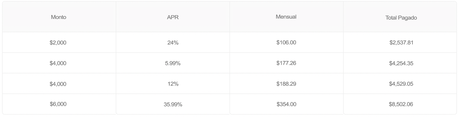 Las tasas de porcentaje anual difieren de un prestamista a otro y dependen en gran medida de su perfil de crédito y capacidad para pagar el préstamo; sin embargo, a continuación se muestran algunos ejemplos de cómo pueden ser las tasas de interés y los pagos mensuales en función de un plazo de 24 meses: